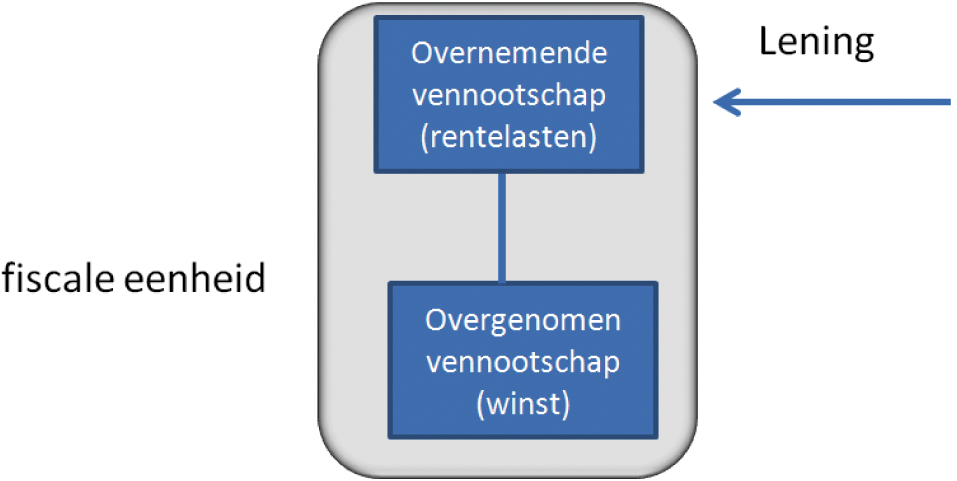 Om excessieve schuldfinancieringen bij overnameholdingconstructies te ontmoedigen, is de fiscale aftrekbaarheid van rente op bovenmatige schuldfinanciering bij overnames gevolgd door voeging in een fiscale eenheid beperkt door invoering van een overnameholdingbepaling. In de hierna opgenomen figuur wordt dit geïllustreerd: