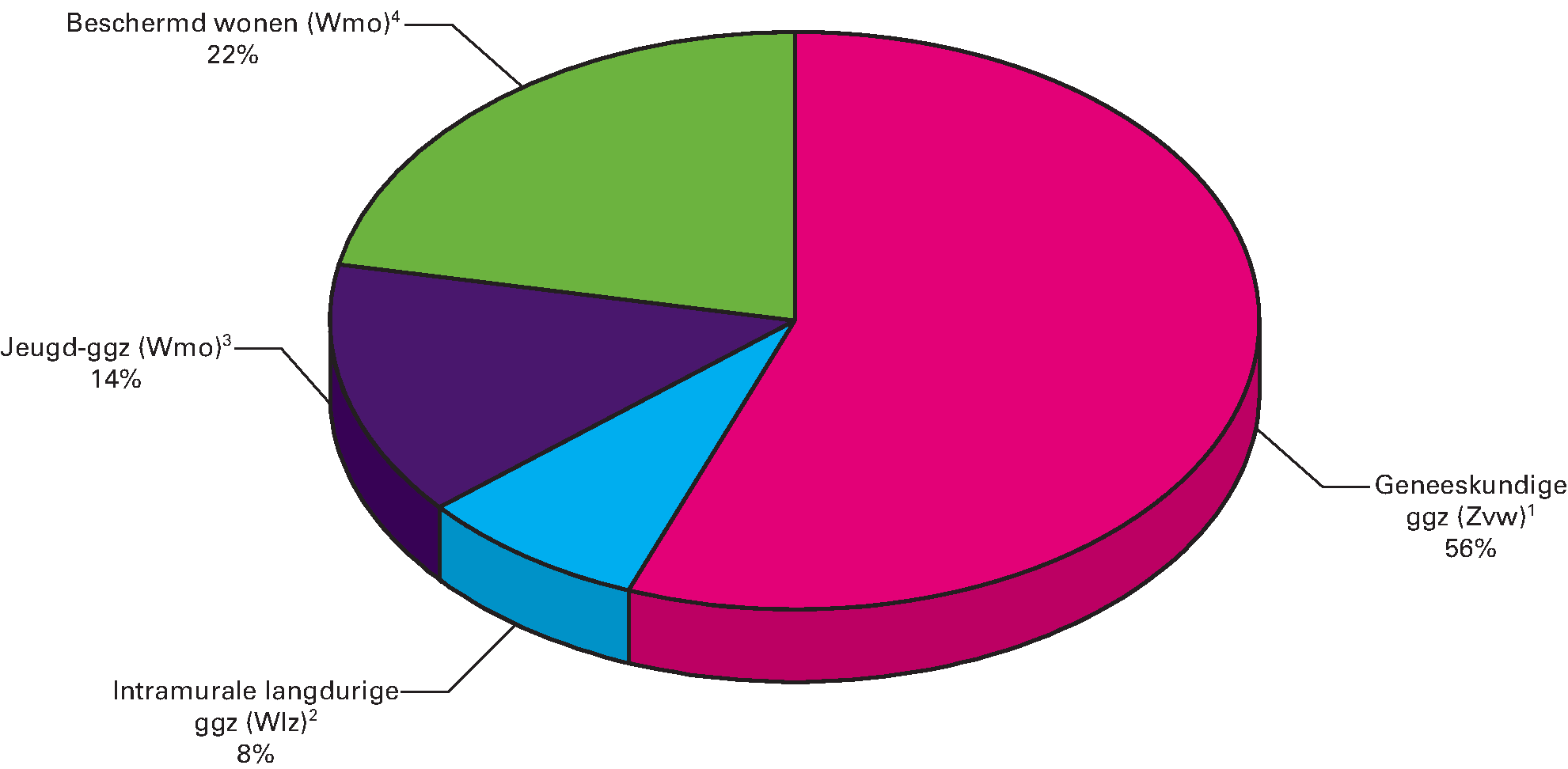 De middelen voor de geestelijke gezondheidszorg zijn in het BKZ verdeeld over de geneeskundige ggz (Zvw) en intramurale langdurige ggz (Wlz). Daarnaast zijn er per 2015 middelen overgeheveld vanuit de oude AWBZ naar Beschermd wonen onder de Wmo (gemeenten). Ook zijn middelen voor de jeugd-ggz overgeheveld vanuit de Zvw en de oude AWBZ naar de Jeugdwet (gemeenten). De middelen voor Beschermd wonen en voor de Jeugdwet vallen onder de begrotingsgefinancierde BKZ-uitgaven.