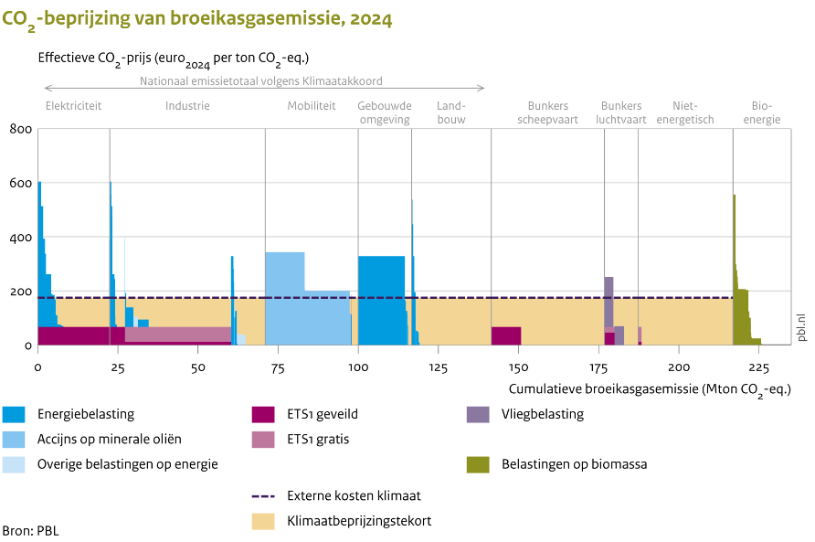 Onderstaande figuur visualiseert de externe kostenbenadering in de verschillende sectoren voor alle broeikasgasemissies. Aangezien voor het lopende jaar onvoldoende data beschikbaar is, is net als vorig jaar de analyse gemaakt op basis van data uit het voorgaande jaar. Dit betreft in deze bijlage het jaar 2024. De inventarisatiebenadering kijkt daarentegen voor ieder jaar naar data van het lopende jaar, hier dus 2025. De figuur voor de externe kostenbenadering is opgesteld door PBL. De horizontale as toont de totale emissies van broeikasgassen die de relevante basis zijn voor de beprijzing, gebaseerd op de emissies als gevolg van het gebruik van fossiele brandstoffen en andere emissies die niet gerelateerd zijn aan fossiele brandstoffen. Op de verticale as wordt de hoogte weergegeven van zowel de expliciete als impliciete prijzen per ton CO2-equivalent. Elk vak in de figuur komt overeen met een bepaald deel van de emissies waarvoor dezelfde CO2-prijs geldt. De breedte van de vakken geeft aan welk deel van de emissies onderhevig is aan deze CO2-prijs. De kleuren geven aan welke beleidsinstrumenten bijdragen aan welk gedeelte van de totale effectieve CO2-prijs. De paarse stippellijn geeft de gebruikte hoogte aan van de externe kosten voor wat betreft het klimaat. Dit geldt als referentieprijs en bedraagt 174 euro/ton CO2 in 2024). Het beprijzingstekort - oftewel ‘fossiele voordeel’ - wordt berekend door het verschil tussen de referentieprijs van de externe klimaatkosten en de geldende CO2 beprijzing te berekenen voor alle broeikasgasemissies in een sector. Hierbij wordt niet gesaldeerd voor eventuele overschotten in beprijzing. Overschotten worden dus niet in mindering gebracht op het beprijzingstekort.