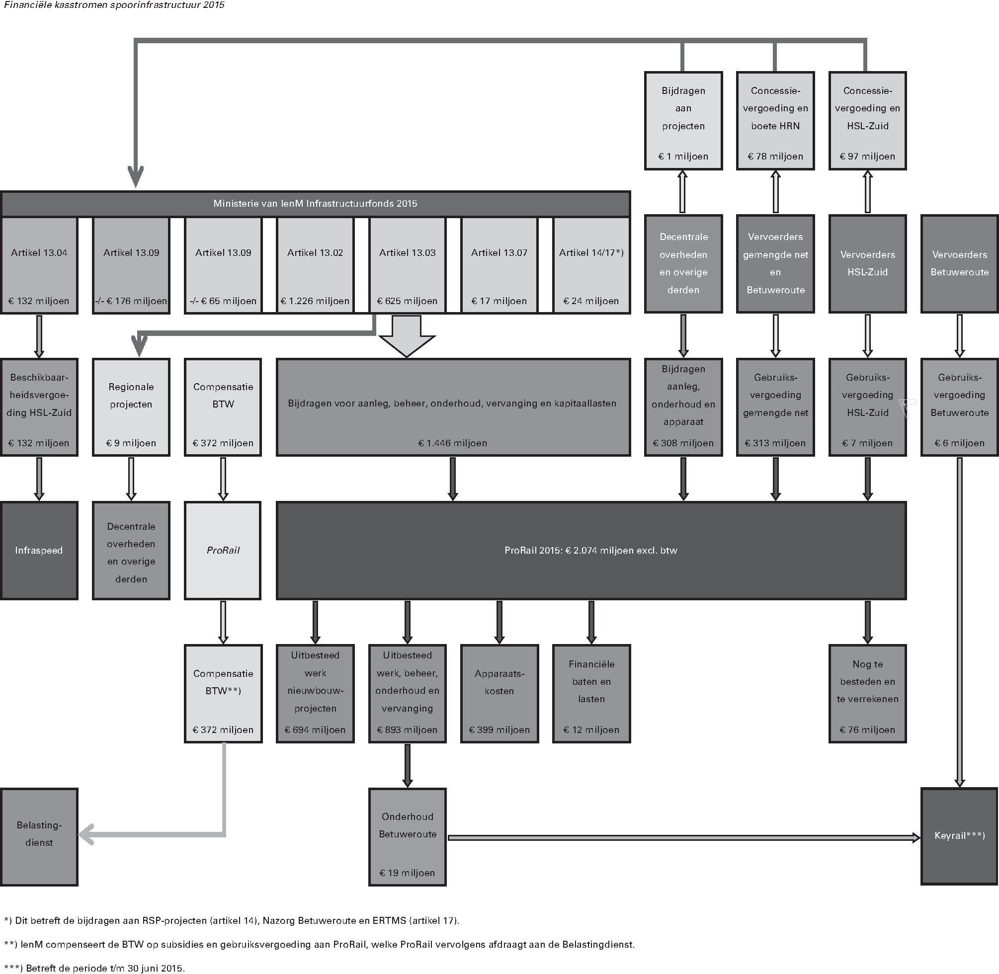 B. Aansluiting tussen de uitgaven op artikel 13 van het Infrastructuurfonds (de betalingen door IenM aan ProRail) en de totale ontvangsten en bestedingen van ProRail (kabinetsreactie op aanbeveling 14, zevende bullet).
