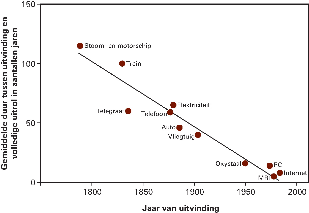 Figuur 2: Sterke toename van technologische vernieuwing gekoppeld aan steeds snellere commerciële uitrol van nieuwe techniek