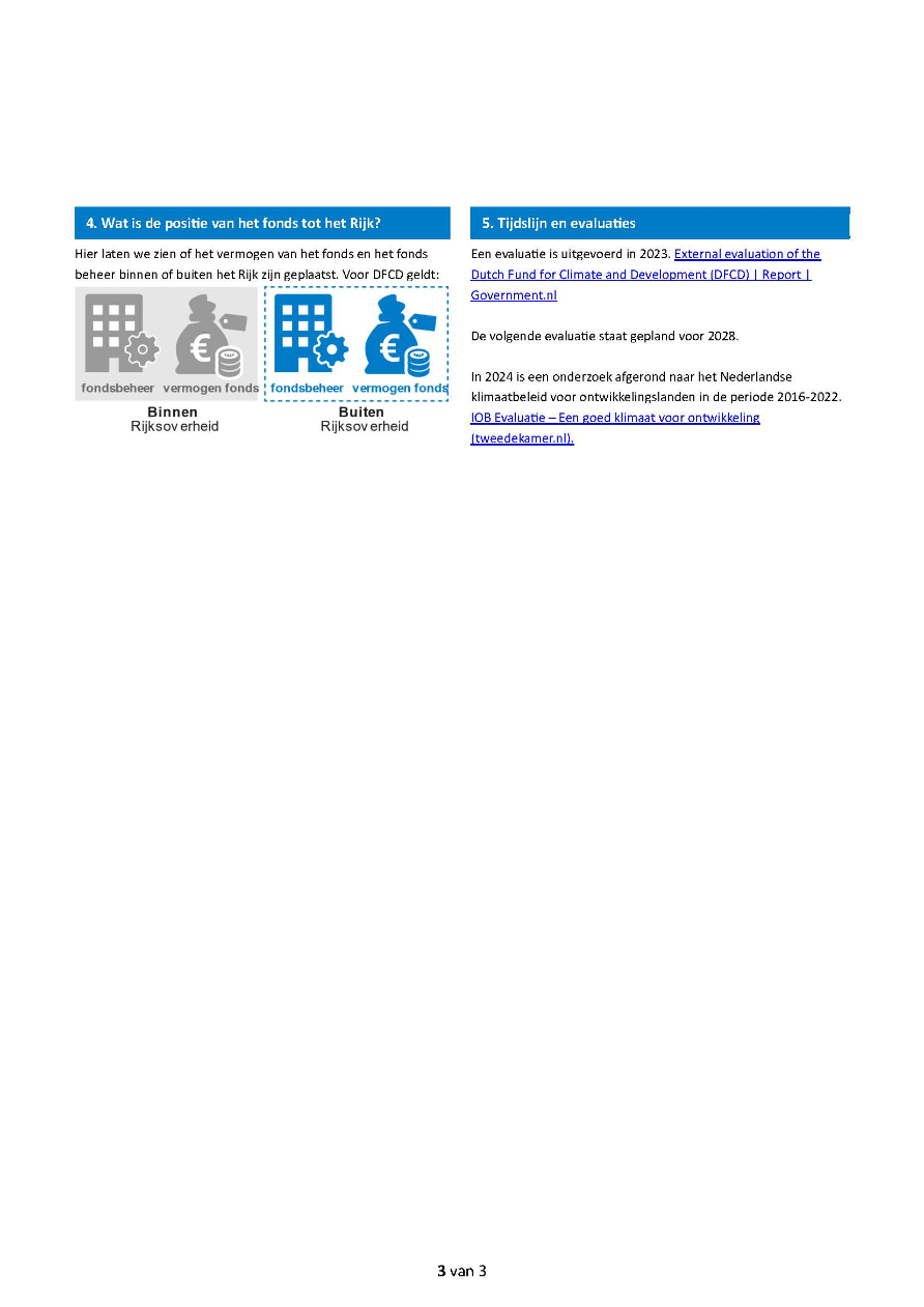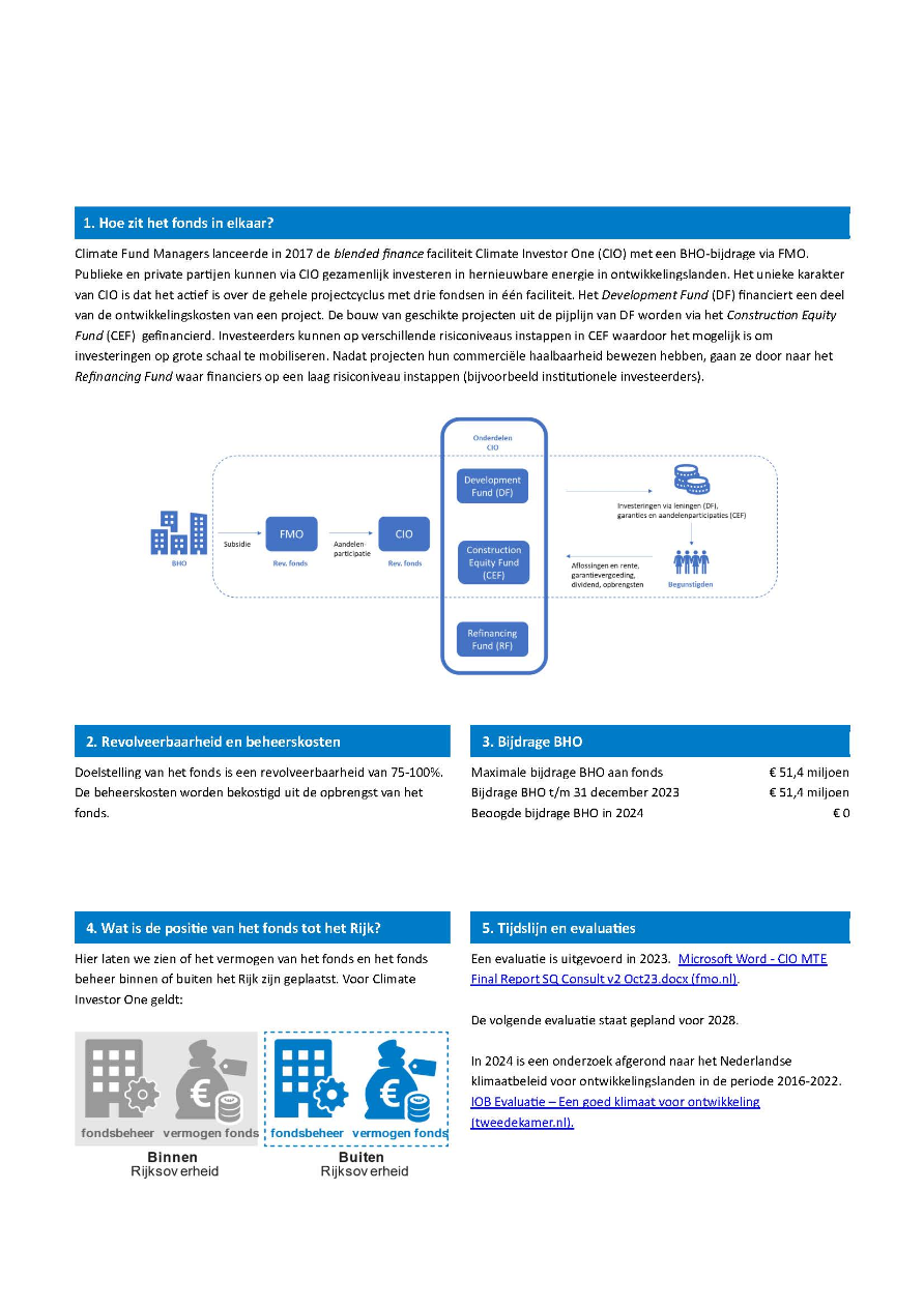 Tijdens de begrotingsbehandeling van Buitenlandse Handel en Ontwikkelingshulp 2024 (36410-XVII) is toegezegd de Tweede Kamer bij de memorie van toelichting bij de begroting 2025 door middel van factsheets te informeren over revolverende fondsen, onder meer over de omvang, looptijd en informatie over wie de fondsen beheren en uitvoeren. De factsheets van dertien revolverende fondsen die onder de verantwoordelijkheid van de Minister voor Buitenlandse Handel en Ontwikkelingshulp vallen zijn daarom als bijlage gevoegd. Een format van het factsheet is eerder met de Tweede Kamer gedeeld (TZ202402-028). Tijdens het Schriftelijk Wetgevingsoverleg van 27 juni jl. hebben de rapporteurs het voorstel ondersteund om dit format te gebruiken.