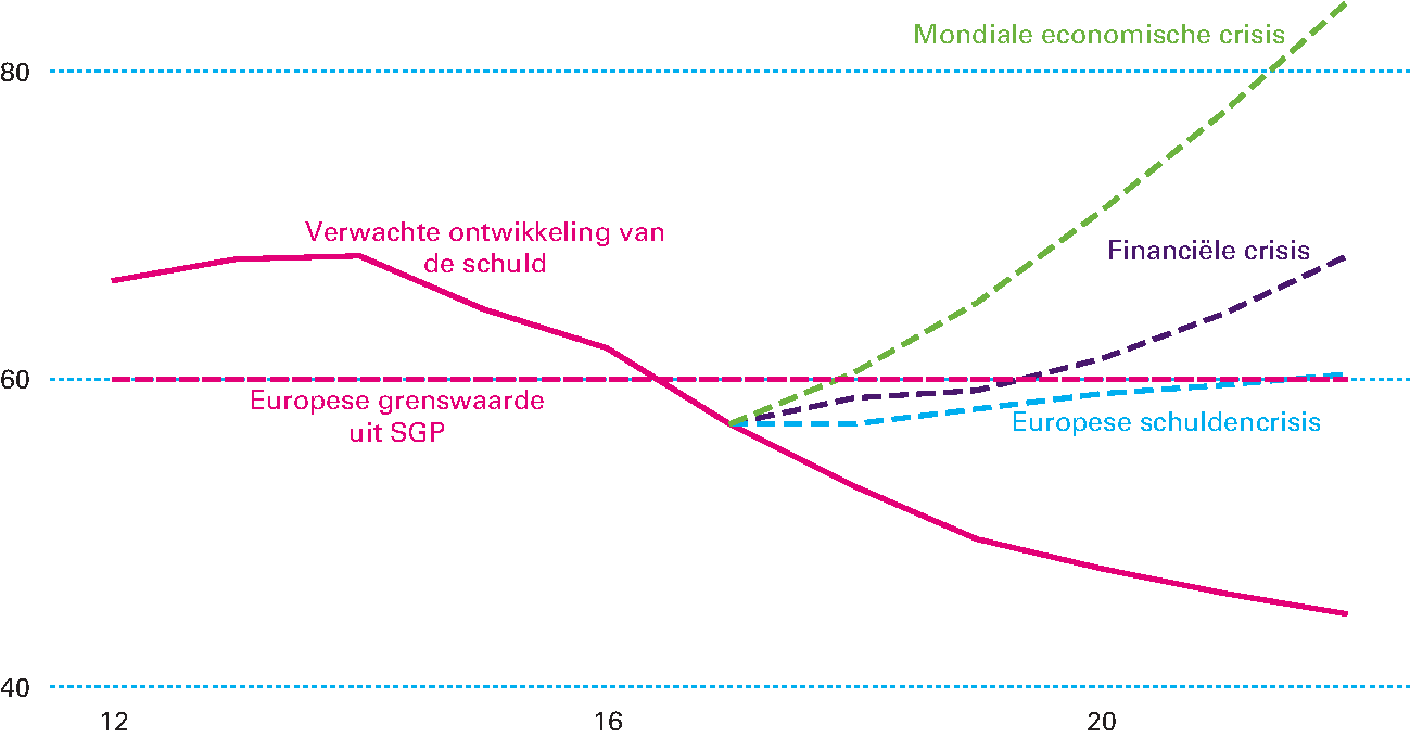 De crisisjaren hebben aangetoond dat een economische of financiële crisis kan leiden tot een grote schok voor de overheidsfinanciën, onder andere doordat een economische terugval leidt tot minder belastinginkomsten of omdat de overheid de helpende hand moet bieden aan financiële instellingen en landen in nood. In de crisis is de Nederlandse overheidsschuld van minder dan 43 procent van het bruto binnenlands product (bbp) in zes jaar opgelopen met bijna 26 procentpunt bbp. Nu de schuld weer dalende is, is het belangrijk om te analyseren wat het effect van mogelijke toekomstige schokken kan zijn op de overheidsbegroting.37