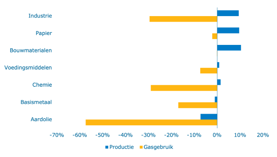 Figuur 1.1.2 Ontwikkeling van het gasgebruik en de productie in de industrie, eerste helft 2022, ten opzichte van dezelfde periode in 2021.