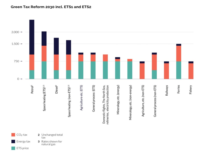 In het kader van de Green Tax Reform, die is gericht op 70% CO2-reductie in 2030 ten opzichte van 1990, heeft Denemarken een expertgroep ingesteld. Deze expertgroep speelt een belangrijke adviesrol bij de totstandkoming en uitvoering van de Green Tax Reform. Zo heeft de expertgroep een model ontwikkeld om de energiebelastingen om te zetten in CO2-belastingen. Uitgaande van zoveel mogelijk uniforme beprijzing heeft de expertgroep een voorstel gedaan hoe het vereiste beprijzingsniveau kan worden uitgebreid naar andere sectoren en ook mogelijke terugsluismaatregelen in kaart gebracht. De expertgroep adviseerde in februari 2022 over een CO2-belasting op energie gerelateerde emissies (deel 1) en zal dit najaar over de niet-energie gerelateerde emissies in de landbouw adviseren (deel 2).[1] Uitgangspunt van dit advies is een zoveel mogelijke uniforme tariefstelling voor emissies uitgedrukt in CO2-equivalenten voor alle sectoren waardoor beprijzingstekorten worden voorkomen. Daarbij wordt rekening gehouden met de uitbreiding en aanscherping van het EU ETS-systeem en koolstoflekkage. Bij de tariefvaststelling is uitgegaan van een vaste nationale CO2-prijs die onafhankelijk is van de prijsschommelingen in het ETS. Een meerderheid in het Deense parlement heeft ingestemd met een akkoord dat in grote lijnen de conclusies (deel 1) van de expertgroep volgde. De komende jaren zal het advies over de energieproducten worden uitgewerkt in wetgeving. Deze wetgeving moet in januari 2025 in werking treden met een geleidelijke infasering tot 2030. Ter compensatie zullen er gerichte subsidies worden ingevoerd.